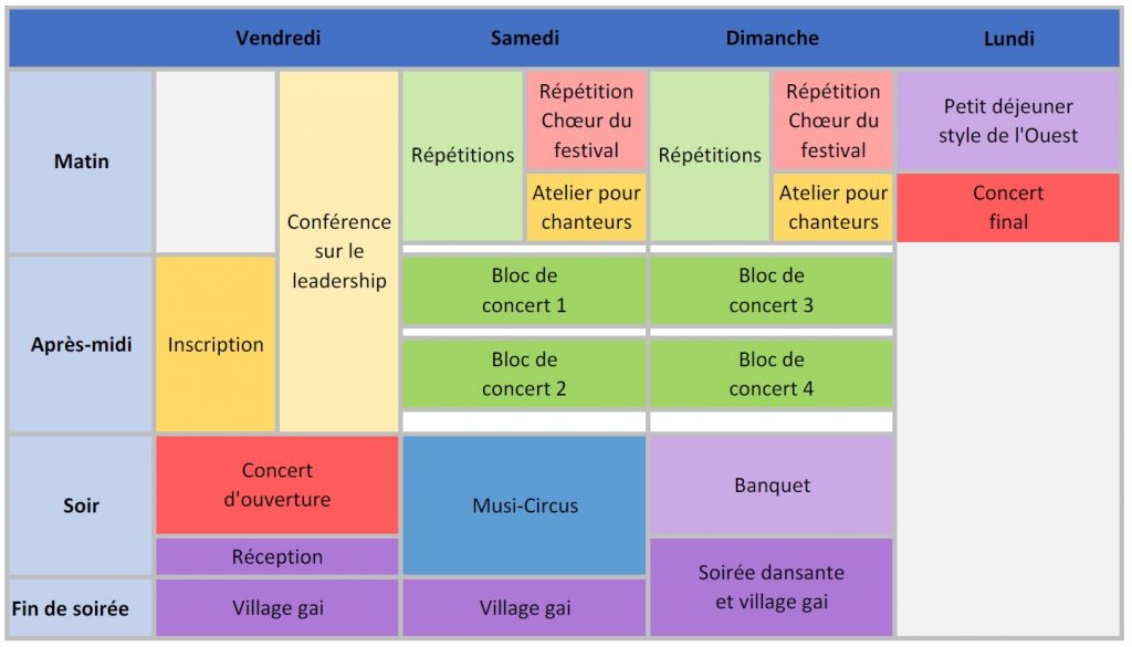 Le festival de Calgary met en scène un unique chœur du festival en formation SATB. Le Chœur du Festival sera à lui seul un blockbuster – 200 voix ou plus accompagnées d’un orchestre lors du concert de clôture au Bella Concert Hall.